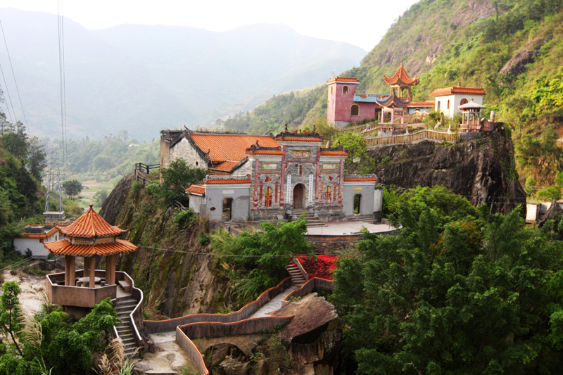 上寺庙只有一条唯一的小石径,径中有一个小石门,可并排走过两个人,入了石门,是一叠蜿蜒的石阶,拾级而上。小径中对面有一个50多米高的大石,中段一部分与庙下大石接连,两石间下面是一个深潭,叫做“响水潭”,水流滚滚,湍急咆哮。河水从石底暗洞中流过,潭中大量水花飞溅,发出“隆隆”响声。水涨时,响声更大,有如阵阵沉雷,经久不息。四周是峭壁深涧,野草杂树丛生,下有长年清澈的清水缸(潭)和长年浑浊的浑水缸(潭),还有只闻响声而不见流水的暗潭(地下河),有见流水入而不只把水出的水桶潭。旁边还有一线天、仙女石、铜鼓石、鲤鱼石、笋石、猪斗湖、锅盖潭、石屋等奇景。